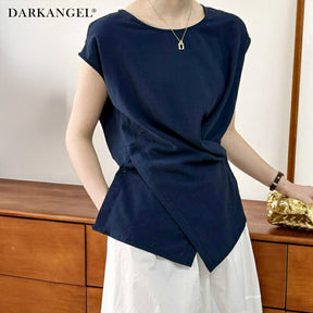 【 サイドボタンドレープトップス 】 サイドに施した立体的なドレープと、 裾のアシンメトリーデザインが視線を引く、 洗練されたノースリーブトップス。 柔らかく肌に馴染む素材で、さらっと軽い着心地。 大人のカジュアルにもキレイめにもマッチする万能な一枚。 |