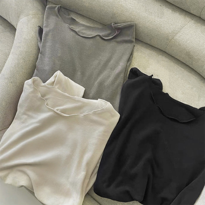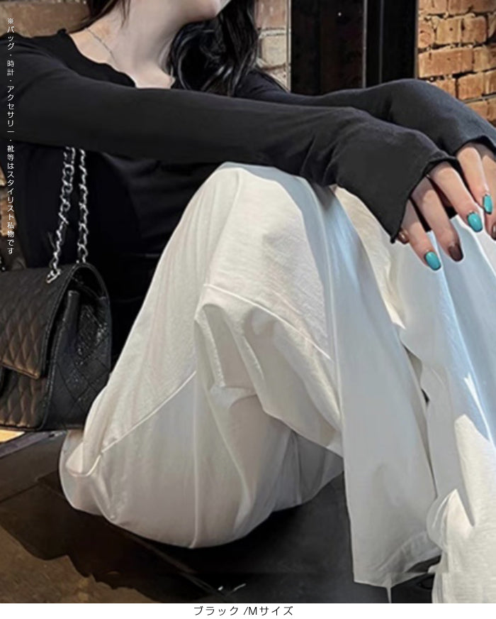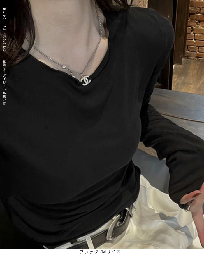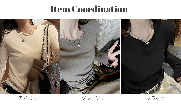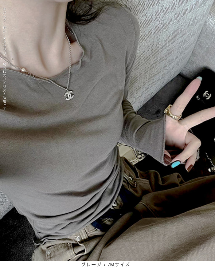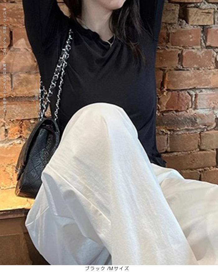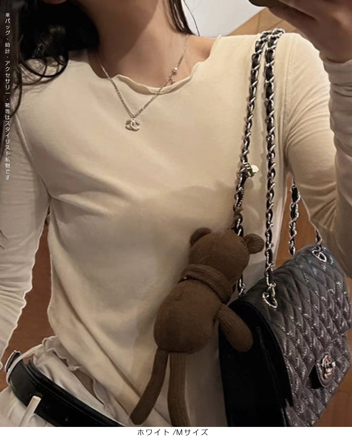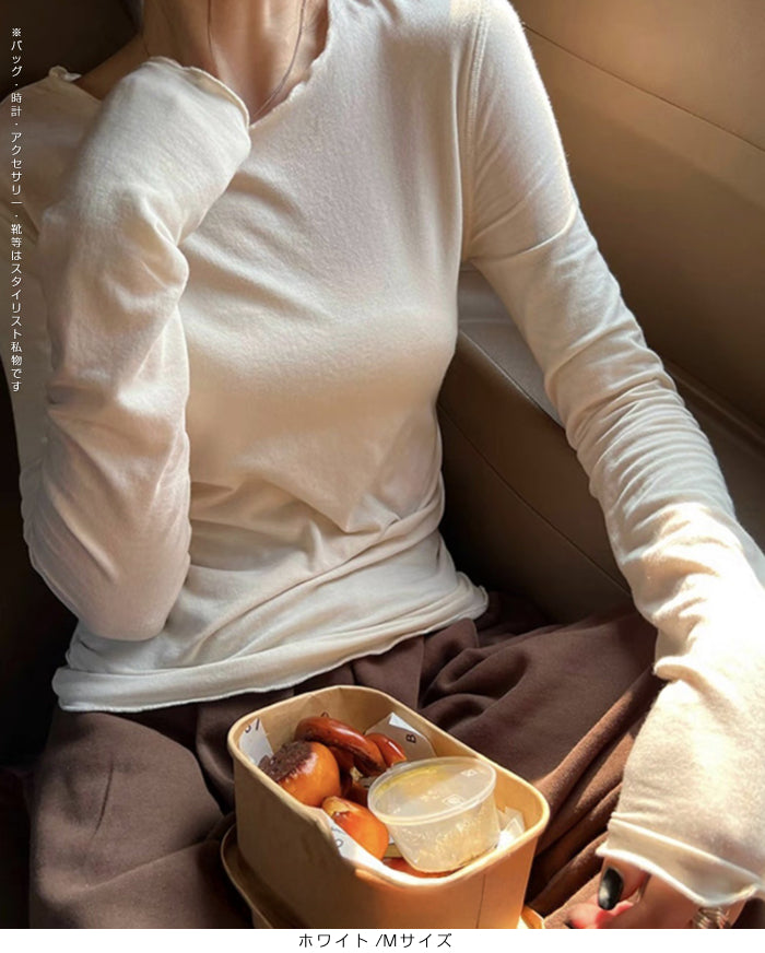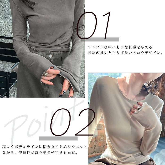 【メロウカットソー】 程よくフィットしながらも締め付け感のない、柔らかな風合いのロンT。 メロウフリルの縁取りが、さりげない甘さをプラス。 ロングスリーブで、抜け感のあるスタイルを演出できます。 《商品ポイント》 ・薄手で柔らかなカットソー素材で快適な着心地 ・ロングスリーブでトレンド感&防寒対策も◎ ・ネック・袖・裾にメロウ加工を施し、フェミニンな印象に 《デザイン・シルエット》 シンプルな中にもこなれ感を与える、長めの袖丈とさりげないメロウデザイン。 程よくボディラインに沿うタイトめシルエットながら、伸縮性があり動きやすさも両立。 首元はやや横広がりのラウンドネックで、デコルテを美しく見せてくれます。 《コーディネート提案》 ・デニムやカーゴパンツと合わせて、抜け感あるカジュアルスタイルに ・マーメイドスカートやジャンスカのインナーにも相性◎ ・キャミワンピやビスチェとレイヤードすれば、よりトレンド感ある印象に 《サイズ・カラーバリエーション》 サイズ:M / L カラー:アイボリー/グレージュ/ブラック 《素材・機能性》 素材:綿65%、ポリエステル35% 厚み:普通 硬さ:柔らかめ 透け感:ややあり(特に淡色はインナー推奨) 伸縮性:良好 裏地:なし |