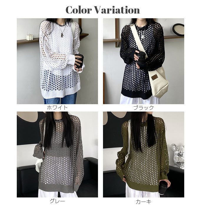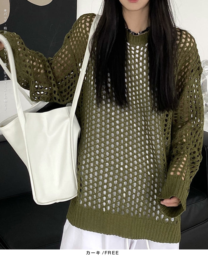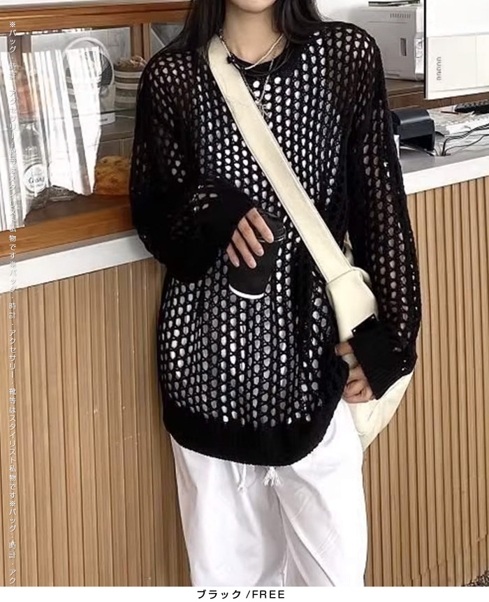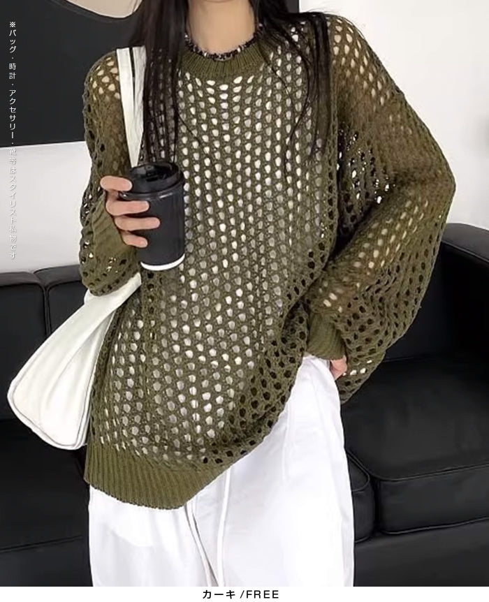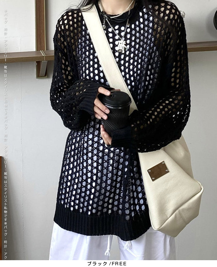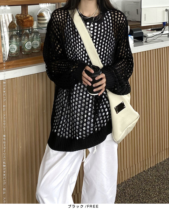 旬な“透け”を楽しむ、軽やかな透かし編みメッシュニット。 大きめの編み目が通気性よく、 インナーとのレイヤードで表情が変わる一枚です。 薄手でサラっと着られるから、 春先~夏の冷房対策、 秋口の重ね着までロングシーズン活躍。 《商品ポイント》 通気性の良い大きめメッシュ:ドライな着心地でムレにくい レイヤード専用級の存在感:キャミ・タンク・Tシャツ・ワンピに重ねて着映え オーバーサイズ×長め丈:体のラインを拾いにくく、体型カバーにも◎ 軽量・薄手:春夏の外出~室内の冷房対策まで幅広く活躍 《デザイン・シルエット》 ざっくり透かし編み:程よい“肌見せ”が今っぽい ドロップショルダー:肩線を落として抜け感を演出 クルーネック:ネックレスやチョーカーとも好相性 リブ仕様の裾・袖口:コーデのバランスを引き締め、もたつきにくい 《コーディネート提案》 王道レイヤード:リブタンク+ワイドデニム+フラットサンダル きれいめカジュアル:キャミワンピの上から重ね、ミニショルダー+パンプス ストリートMIX:ロゴT+カーゴパンツ+キャップでこなれ感 《サイズ・カラーバリエーション》 サイズ:FREE カラー:グレー/ブラック/ホワイト/カーキ 《素材・機能性》 ・素材:ポリエステル100% ・透け感:あり(インナーと組み合わせて楽しめます) ・伸縮性:あり(優しくフィット) ・厚み:薄手(春〜秋に◎) |