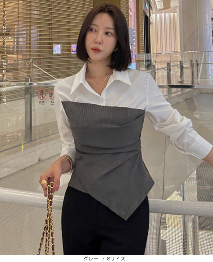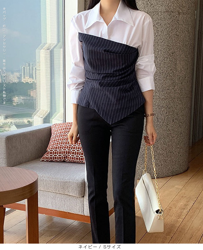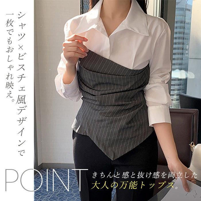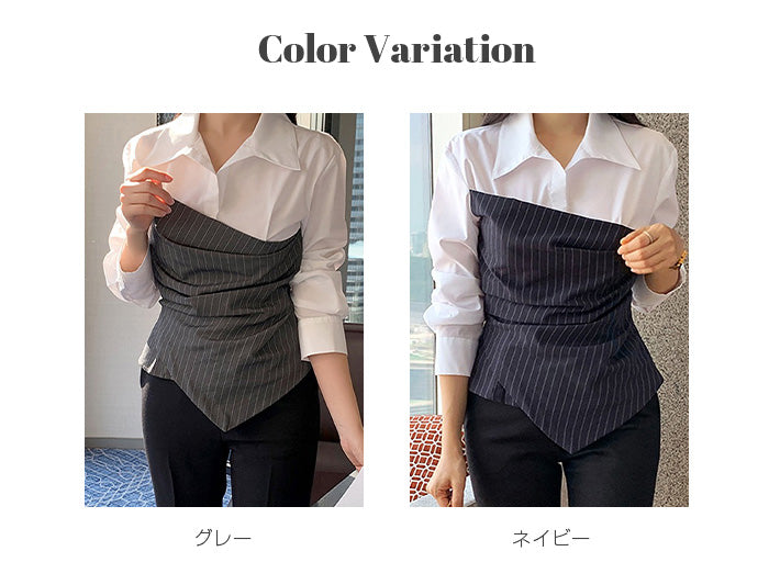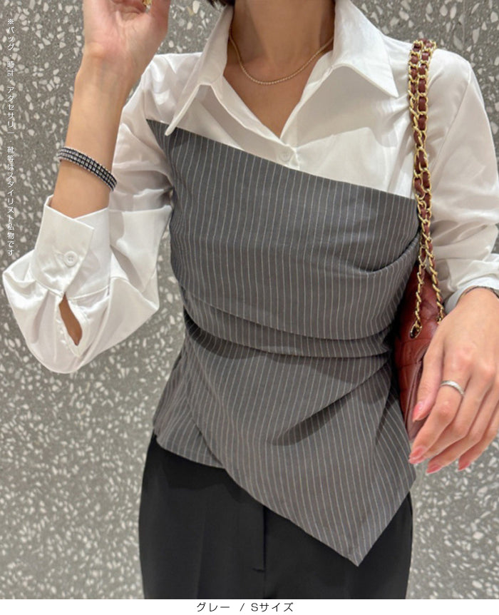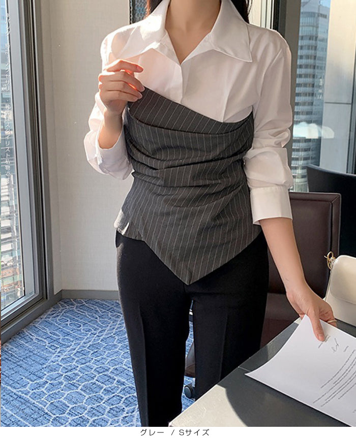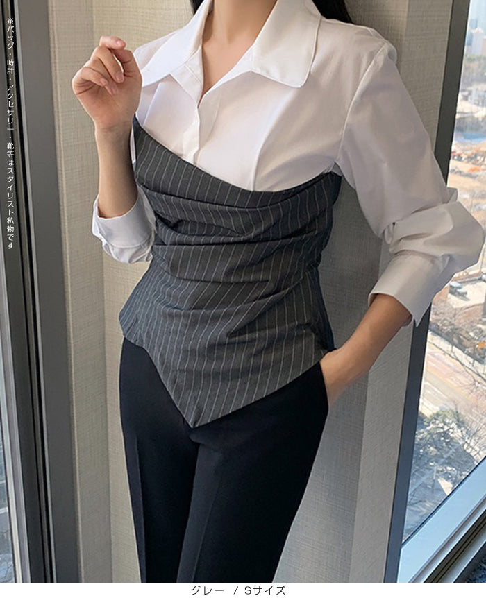 ピンストライプビスチェ風ドッキングシャツブラウス
