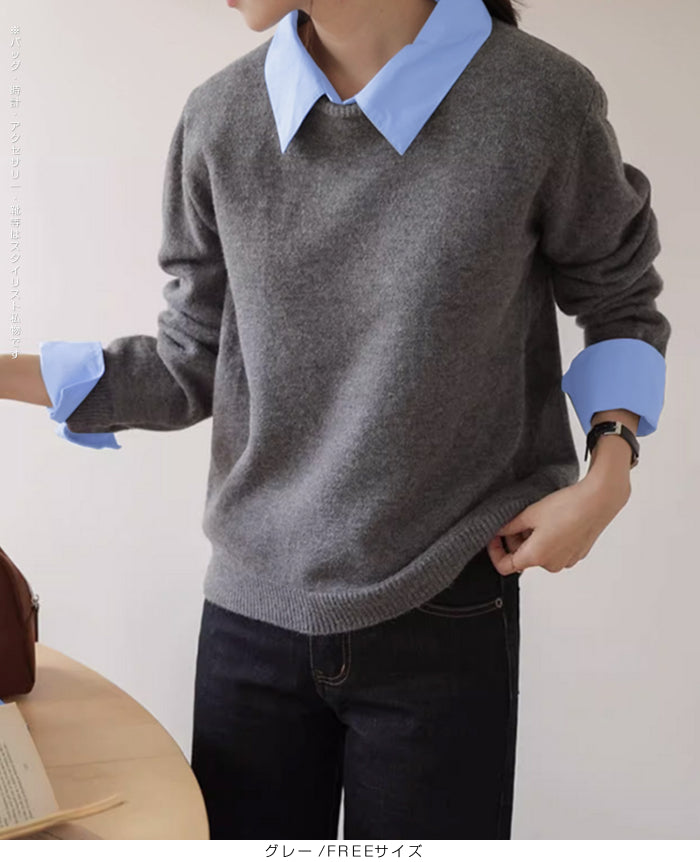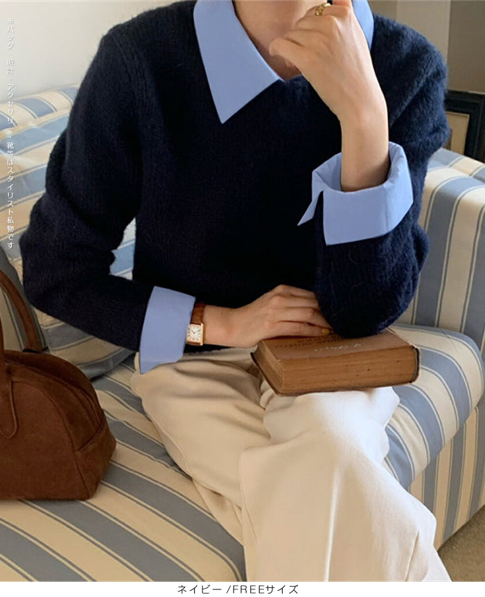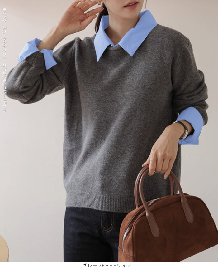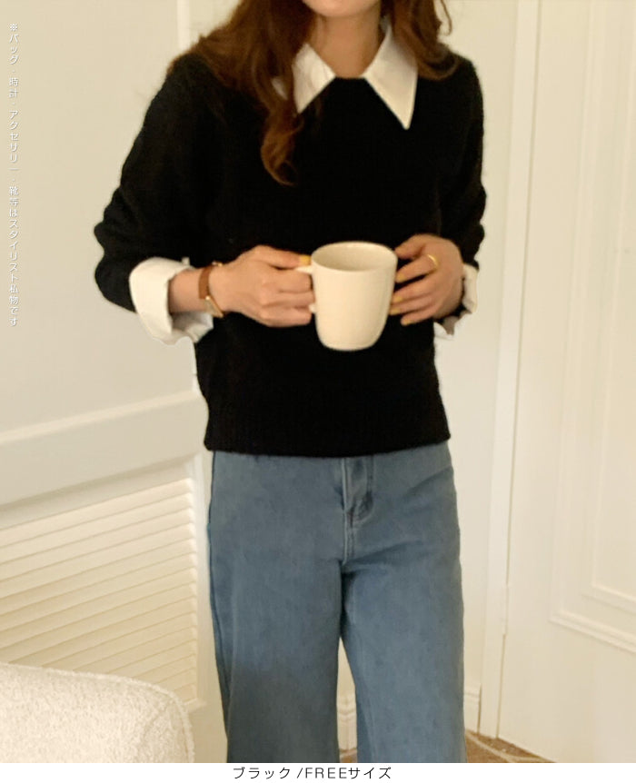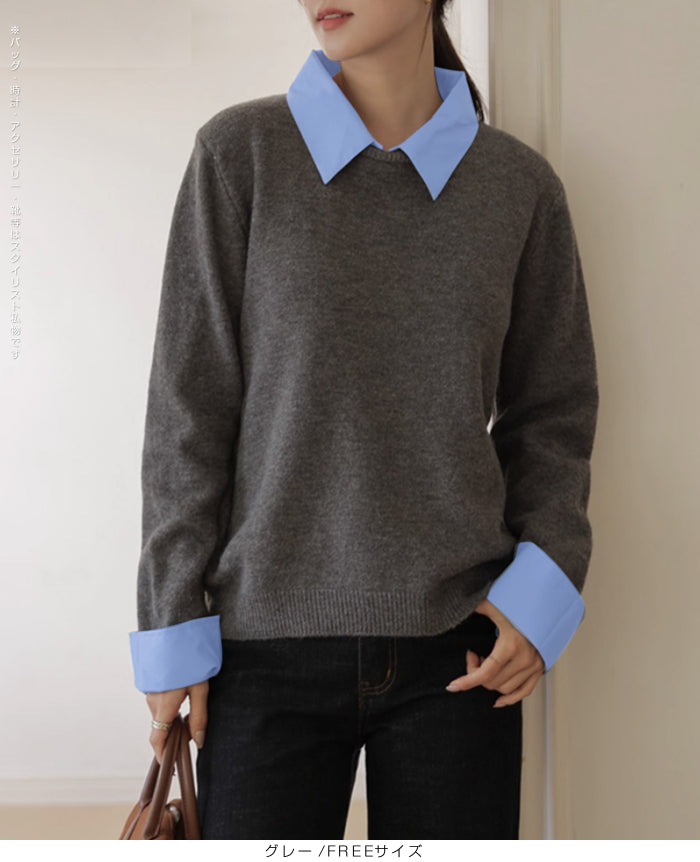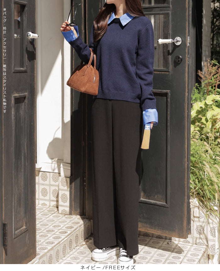 【 フェイクツーピースニット 】 シャツとニットを重ね着したようなスタイルが一枚で完成する フェイクツーピースニット。 襟と袖口にシャツ生地をドッキングすることで、 レイヤード感を演出しながらも着心地は軽やかでストレスフリー。 カジュアルからオフィスシーンまで幅広く活躍できる、 着回し力抜群の万能アイテムです。 《商品ポイント》 重ね着風デザインでコーデが一瞬で完成 襟・袖口の配色シャツ切替で上品な印象 ニット部分は柔らかく伸縮性のある素材で快適 一枚でトレンド感ときちんと感を両立 デニム・スラックス・スカートなどボトムを選ばない万能さ 《デザイン・シルエット》 程よくゆとりのあるシルエットで、 体のラインを拾いすぎず着やすいデザイン。 襟元や袖口のシャツ風ディテールが スタイリングのアクセントになり、 顔まわりをすっきりと見せてくれます。 長めの丈感でアウトでもインでもバランス良く決まるシルエット。 《コーディネート提案》 オフィススタイル:スラックスやタイトスカートと合わせて上品に。 休日コーデ:デニムやワイドパンツでカジュアルに。 トレンド感UP:ロングスカートやチェーンバッグと合わせれば女性らしいこなれ感も。 季節感プラス:ジャケットやコートのインナーとしても重ね着風が活きる万能トップス。 《サイズ・カラーバリエーション》 サイズ:FREEサイズ カラー:ブラック/ ネイビー / グレー 《素材・機能性》 ・素材:ポリエステル100% ・透け感:なし ・伸縮性:あり ・厚み:普通(春~秋に◎) |